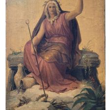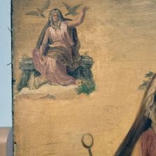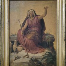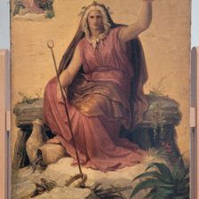 Gerade „Die Sage“ schlummerte dabei bis zur Leihanfrage aus Bad Arolsen recht unscheinbar im Wildunger Depot: Sie war mit einer verschmutzten Oberfläche und einem beschädigten Rahmen nicht besonders ansehnlich gewesen. Umso größer war die Überraschung, die die fachkundige Reinigung des Bildes von Restauratorin Silvia Behle (Upland Restaurierungen Willingen) nun zum Vorschein brachte: eine übermalte kleinformatigere Skizze des Motivs, das einst ab 1850 in weit größerem Format das monumentale Treppenhaus des Neuen Museums in Berlin zierte! Vom Preußischen König Friedrich Wilhelm IV. hatte Kaulbach, zu dieser Zeit schon Hofmaler des Bayerischen Königs Ludwig I. in München, den Auftrag erhalten, das oberste Stockwerk des von Friedrich August Stüler ab 1843 erbauten Treppenhauses auszugestalten. Auf gut 75 Metern umlaufender Fläche schuf er in zwanzig Jahren künstlerischer Arbeit sechs großformatige Wandgemälde, die mit „Der Zerstörung Jerusalems“, der „Hunnenschlacht“ oder dem „Zeitalter der Reformation“ die Geschichte der Menschheit nacherzählten. Kleinere Fresken auf Goldgrund trennten die figurenreichen Szenen der Monumentalbilder, die ihn berühmt machen sollten. „Die Sage“ fand sich dabei als gemalte Supraporte an der Südwand des eindrucksvollen Treppenhauses. Leider hat keines dieser bedeutenden Arbeiten Kaulbachs die Zeit überdauert: Sie waren bei alliierten Luftangriffen am 22./23. November 1943 vollständig zerstört worden. Allein die Tatsache, dass sich in Bad Wildungen eine wichtige Vorstudie der „Sage“ erhalten konnte, war eigentlich schon Überraschung genug. Der Initiative von Sandra Simshäuser war es zu verdanken, dass dieser Schatz zum 150. Todestag Wilhelm von Kaulbachs aus dem Depot geborgen und zur Restaurierung an Silvia Behle übergeben werden konnte. Diese gute intermuseale Zusammenarbeit wurde jedoch mit einer noch größeren Überraschung belohnt: So stach die Ölskizze nicht nur mit wiedererlangter Schönheit in der Ausstellung „Kaulbach 150“ zwischen anderen Werken hervor, sondern eröffnet durch die von Behle freigelegte, bisher unbekannte Skizze der „Sage“ auch ganz neue Perspektiven! Es gilt, diese bedeutende Entdeckung in einem Aufsatz festzuhalten und „Die Allegorie der Sage“ sowie ihre Provenienz in diesem Zuge genauer zu betrachten.