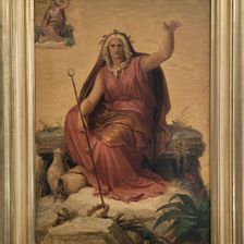 „Die Allegorie der Sage“ stellte einen wichtigen Bestandteil der von Kaulbach in Berlin geschaffenen Wandfresken zur Geschichte der Menschheit dar, die von 1845-65 im Auftrag des Preußischen Königs im großen Treppenhaus des Neuen Museums entstanden und als Hauptwerke des Künstlers galten. Glücklicherweise sind einige Skizzen und Studien dieser Gemälde auf Papier oder Karton erhalten geblieben und können in der aktuellen Ausstellung besichtigt werden. Seltener scheint hingegen die farbige Ölskizze der „Sage“ aus dem Bad Wildunger Depot zu sein. Sie zeigt als zentrales Motiv eine alte Frau mit weißem Haar, die auf einer steinernen Bank sitzt. Während sie mit ihrem Runenstab im Boden wühlt und eine Krone ausfindig macht, umkreisen zwei Vögel ihr Haupt. „Die Sage“ blickt direkt in die Augen des Betrachters, ihr linker Arm ist erhoben. Durch die fachkundige Restaurierung von Silvia Behle konnte im linken oberen Bildbereich eine kleinformatigere Skizze des Motivs freigelegt werden. Sie ermöglicht nun, den Arbeitsprozess des Künstlers in drei Dimensionen zu beleuchten. Vergleicht man zunächst eine Zeichnung des Berliner Wandgemäldes mit dem zentralen Motiv der Ölskizze, so fällt auf, dass zwar der Runenstab, nicht aber die Vögel auf beiden Bildern zu finden sind. Dass diese jedoch von Beginn an Teil der Komposition waren, beweist wiederum die neu entdeckte Miniaturzeichnung – erst durch diesen besonderen Fund ergibt sich damit ein vollständiges Bild der „Allegorie der Sage“, das zuvor noch ganz anders gedeutet werden konnte! Sie wurde von Kaulbach auf dem Höhepunkt seiner Karriere gemalt, längst nachdem er die Düsseldorfer Akademie verlassen hatte und aufgrund seines großen künstlerischen Talents zum Hofmaler des Bayerischen Königs Ludwig I. ernannt worden war. Für die großen Fresken des Neuen Museums in Berlin hatte ihn der Preußische König Friedrich Wilhelm IV. einst persönlich aus München abgeworben. Seine Meisterwerke wurden 1866 mit dem Ritterschlag belohnt. Zu dieser Zeit hatte der gebürtige Arolser bereits mit dem Stuttgarter Verleger Cotta von Cottendorf die weit geschätzten Illustrationen zu Goethes „Reineke Fuchs“ veröffentlicht und als Direktor die Münchner Kunstakademie geleitet. Schon zu Lebzeiten war Wilhelm von Kaulbach mit seinem vielseitigen Schaffen in aller Munde gewesen, zu früh starb er am 7. April 1874 in München an der Cholera. Er hinterließ ein einmaliges Erbe, das in der großen Ausstellung „Kaulbach 150. Maler, Zeichner, Illustrator“ in Bad Arolsen erlebt werden konnte.