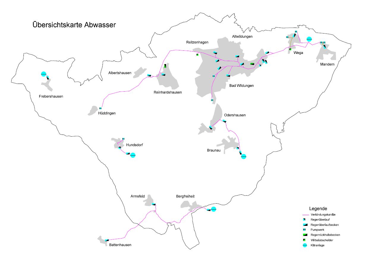 Der größte Teil der öffentlichen Kanäle befindet sich im Einzugsgebiet der Kläranlage Bad Wildungen und hat eine Länge von 150 km. Ein Großteil dieses Entwässerungsgebiets (80%) wird im Mischsystem – Schmutzwasser und Regenwasser werden in einer Leitung abgeführt – entwässert.